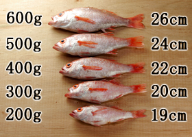 鮮魚の状態の重さと、体長をご参考ください。