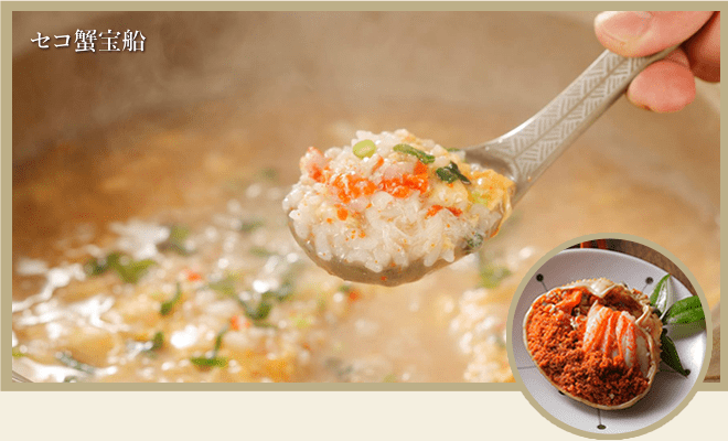 食後は鍋のスープで雑炊。カニ殻肥料米をスープに加え、蟹の宝船®をトッピングして濃厚な雑炊に仕上げます。