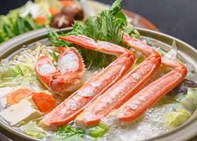 カニ鍋はお好みで、カニすき、カニちりに。先に蟹だけを入れて味わい、あとで野菜類を食べるのがおいしい食べ方。