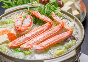 半解凍の蟹をストレートスープ入りの鍋に加えて加熱し、季節の野菜や豆腐を加えて完成
