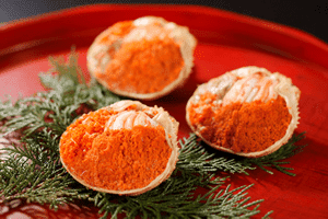 ご家庭で、外子、内子を食べやすいように取りだし、身をほぐし、甲羅に盛って出来たての自家製のセイコガニ 蟹の宝船で。