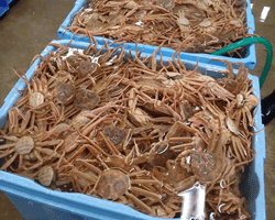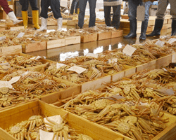美味しいセイコガニの条件とは、活きが良く、内子、外子が確り入っている事。 市場で等級、大きさに分かれたセイコガニの中から、活きの良い内子、外子、身詰まりと、確りしたセイコガニを選びます。