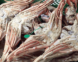 まずは活け締めして、一匹一匹丁寧に洗い、カニが暴れないようにゴムバンドで固定してカゴに仰向けにして入れていきます。