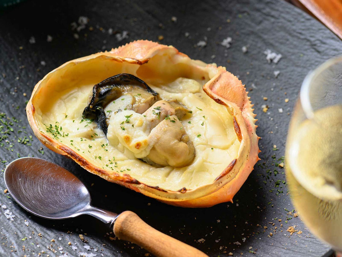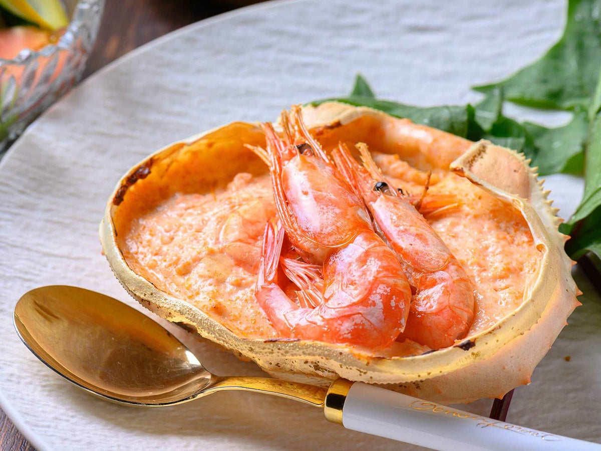 ズワイガニの甲羅が器になっており、そのグラタンひとつあたりに入っている海の幸の量が多いのも特徴です。