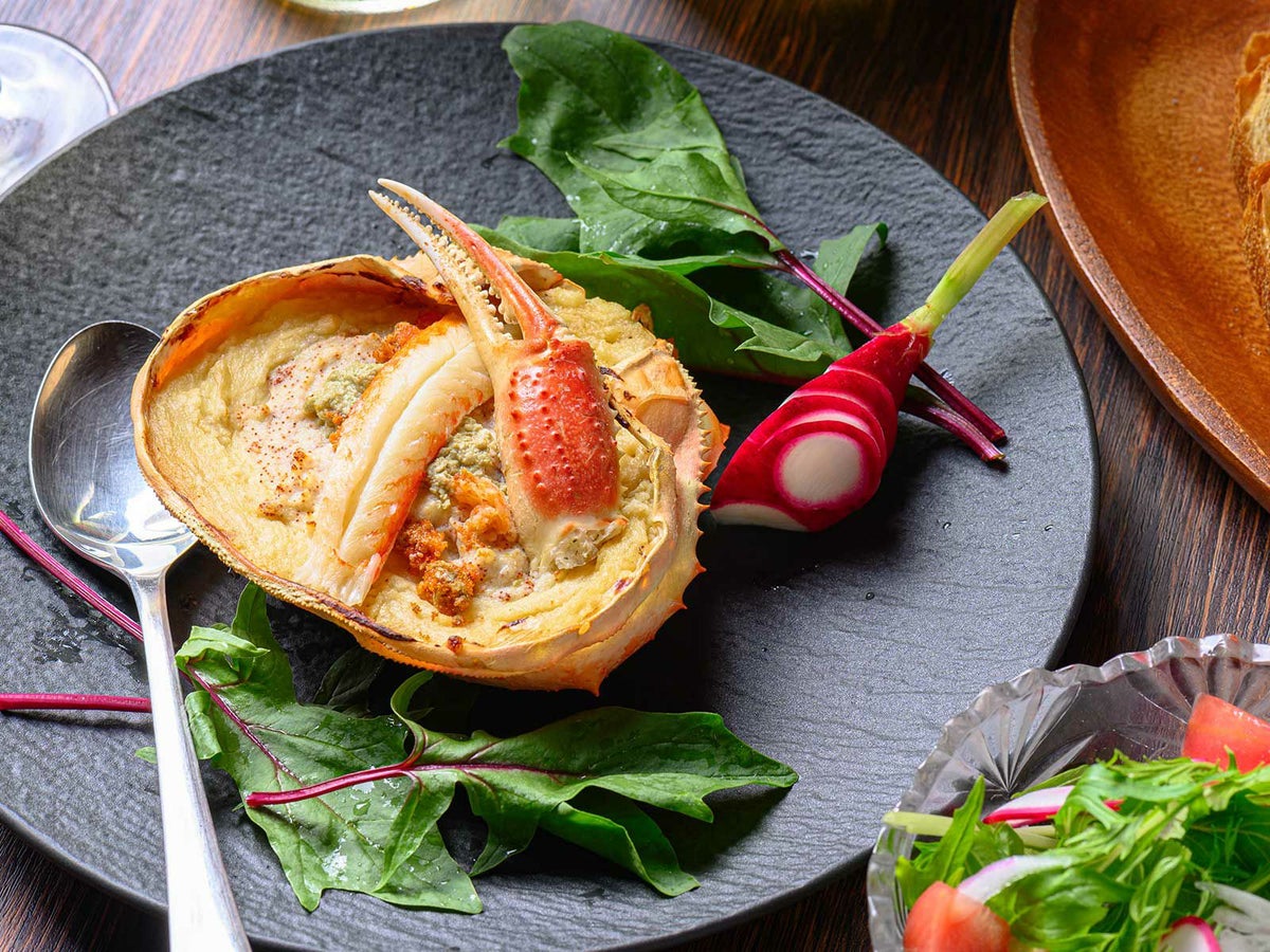 ズワイガニとセイコガニを使用。カニ身は上質なごま油を加えペーストにして、なめらかさと風味をプラス。グラタンソースには、カニ味噌を加え深みを、さらに外子・内子で食感と味わいをだしています。冷凍によって、パサパサ感がでないよう試行錯誤しました。