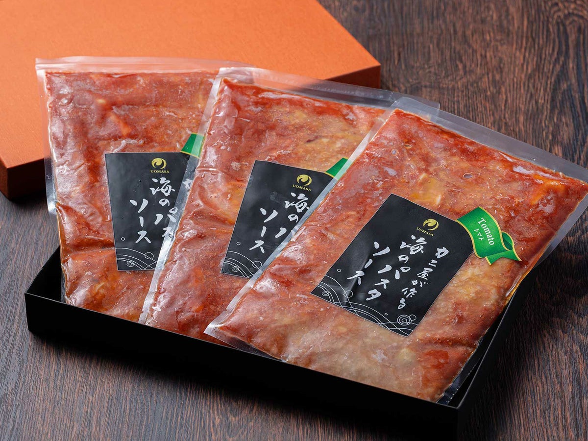 | 原材料 | 魚介出汁:天然魚(マダイ、ヒラメ、スズキ、アカムツなど 日本海山陰西部産)、昆布 バイガイ、クロザコエビ、ケンサキイカ(日本海西部産)トマトソース(トマト、ニンニク、玉ねぎ、白ワイン)ガーリックオリーブオイル、鷹の爪、塩、コショウ |