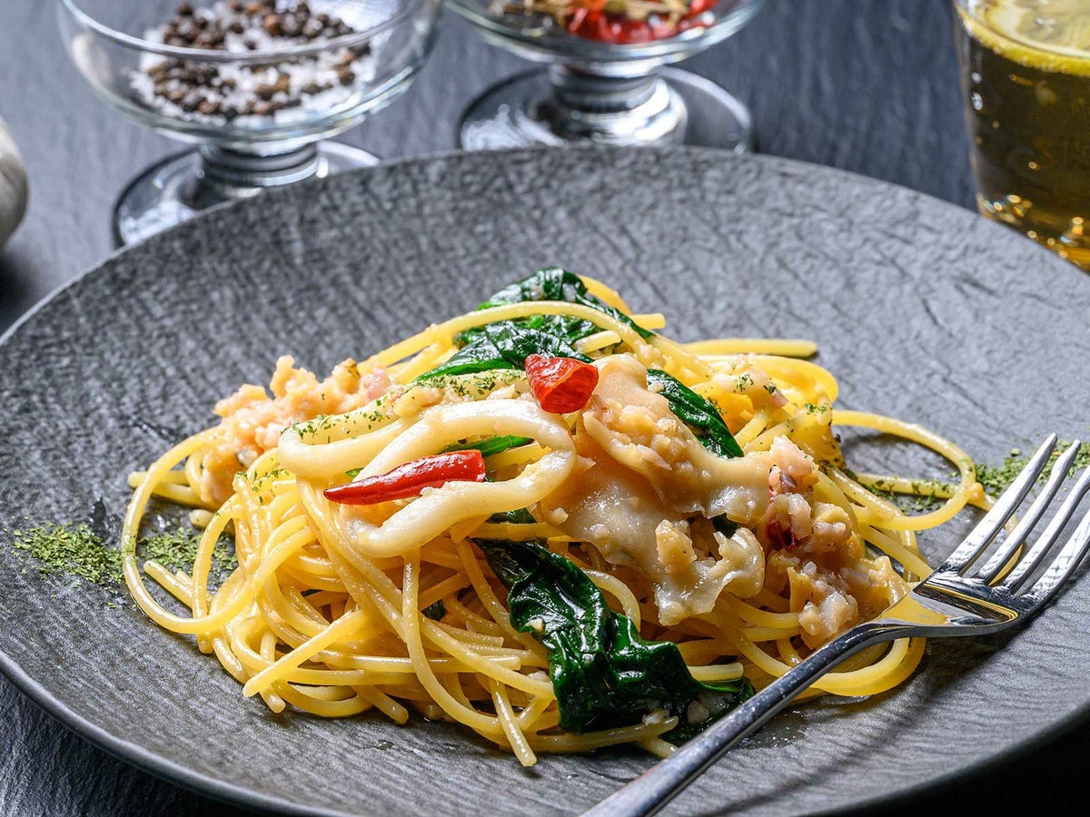 オリーブオイル、にんにく、唐辛子で作るオイルパスタ。白身魚の出汁とにんにくの相性の良さを感じるソースに仕上げました。