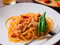 バイガイ、クロザコエビ、ケンサキイカ(日本海西部産)トマトソース(トマト、ニンニク、玉ねぎ、白ワイン)ガーリックオリーブオイル、鷹の爪、塩、コショウ