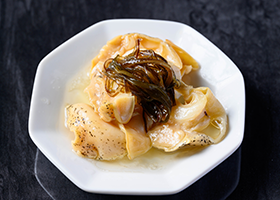 国産のエッチュウバイをふっくら煮上げ、魚政特製のフュメ・ド・ポワソンと上質なオイルで仕上げた、バイ貝特有の香り高い出汁の風味が調和する優しい味わいに。