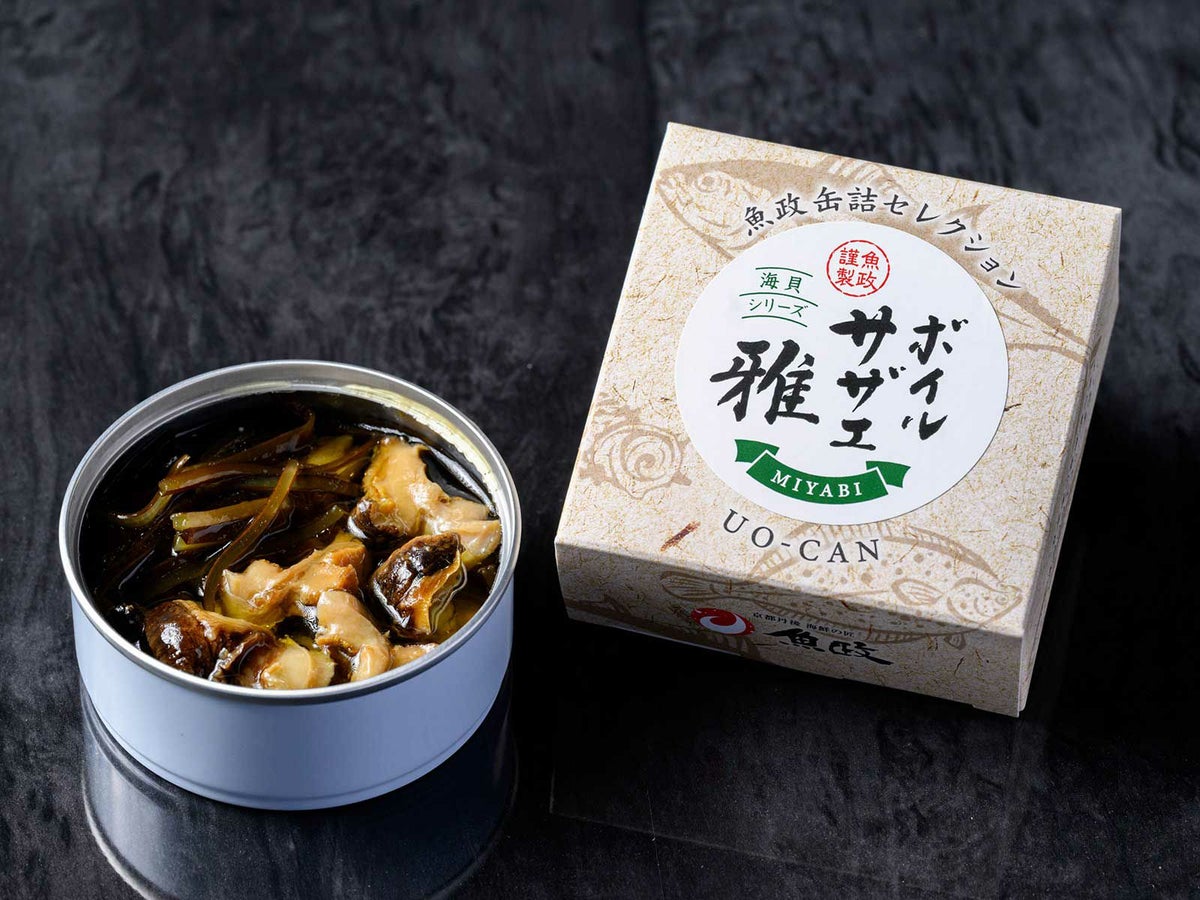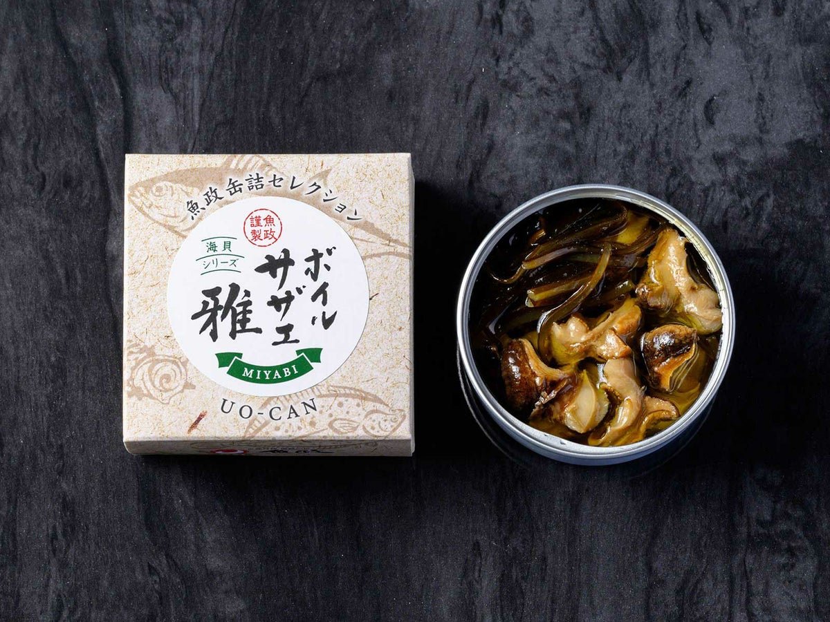 国産の新鮮なサザエをやわらかくボイルし、魚政特製のフュメ・ド・ポワソンと上質なオイルで仕上げた、上品で味わい深い一缶です。サザエは、コリっとした歯ごたえをほんのり残しつつも、やわらかく食べやすい食感に。