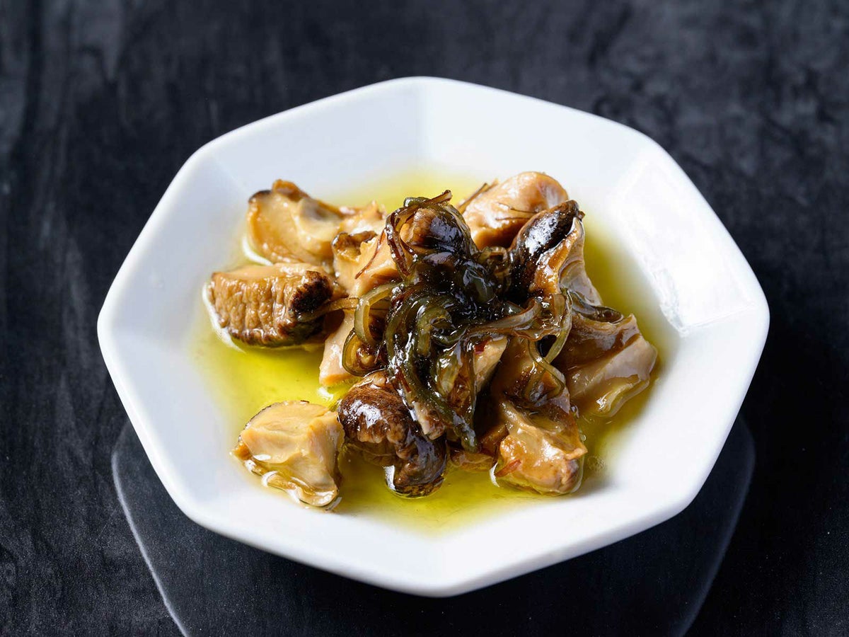 主役となるのは、蒸しアワビ・ボイルサザエ・バイ貝の旨煮。いずれも魚政特製のフュメ・ド・ポワソンと、上質なオイルを合わせ、素材の美味しさを優しく引き立てる味わいに仕上げています。