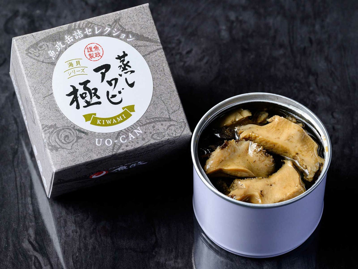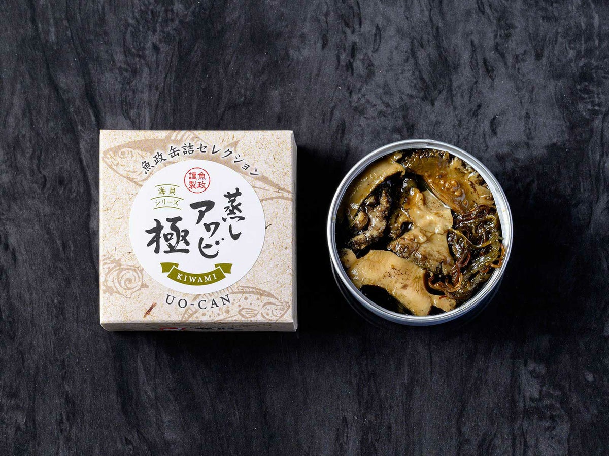 国産の黒アワビ(天然・養殖)を丁寧に蒸し上げ、魚政特製のフュメ・ド・ポワソンとともに上質なオイルに漬け込んだ逸品。アワビは、じっくりと蒸すことで驚くほどやわらかくなり、しっとりとした上品な食感に仕上がっています。
