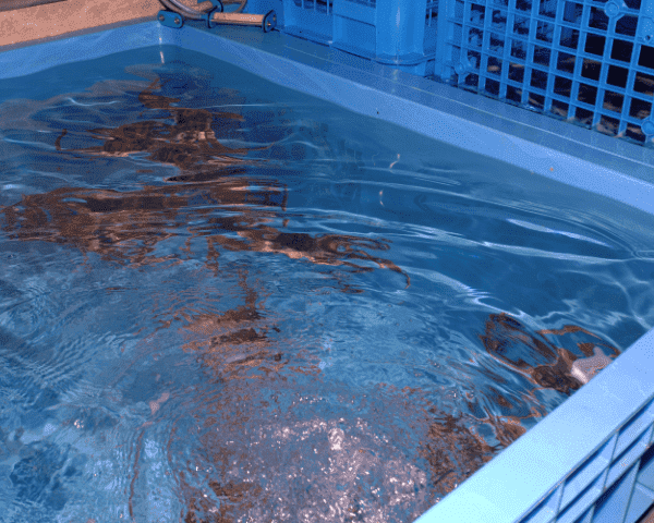 松葉ガニは、低い水温しか生息できないため、鮮魚とは別の低温の特別な水槽が必要になります。