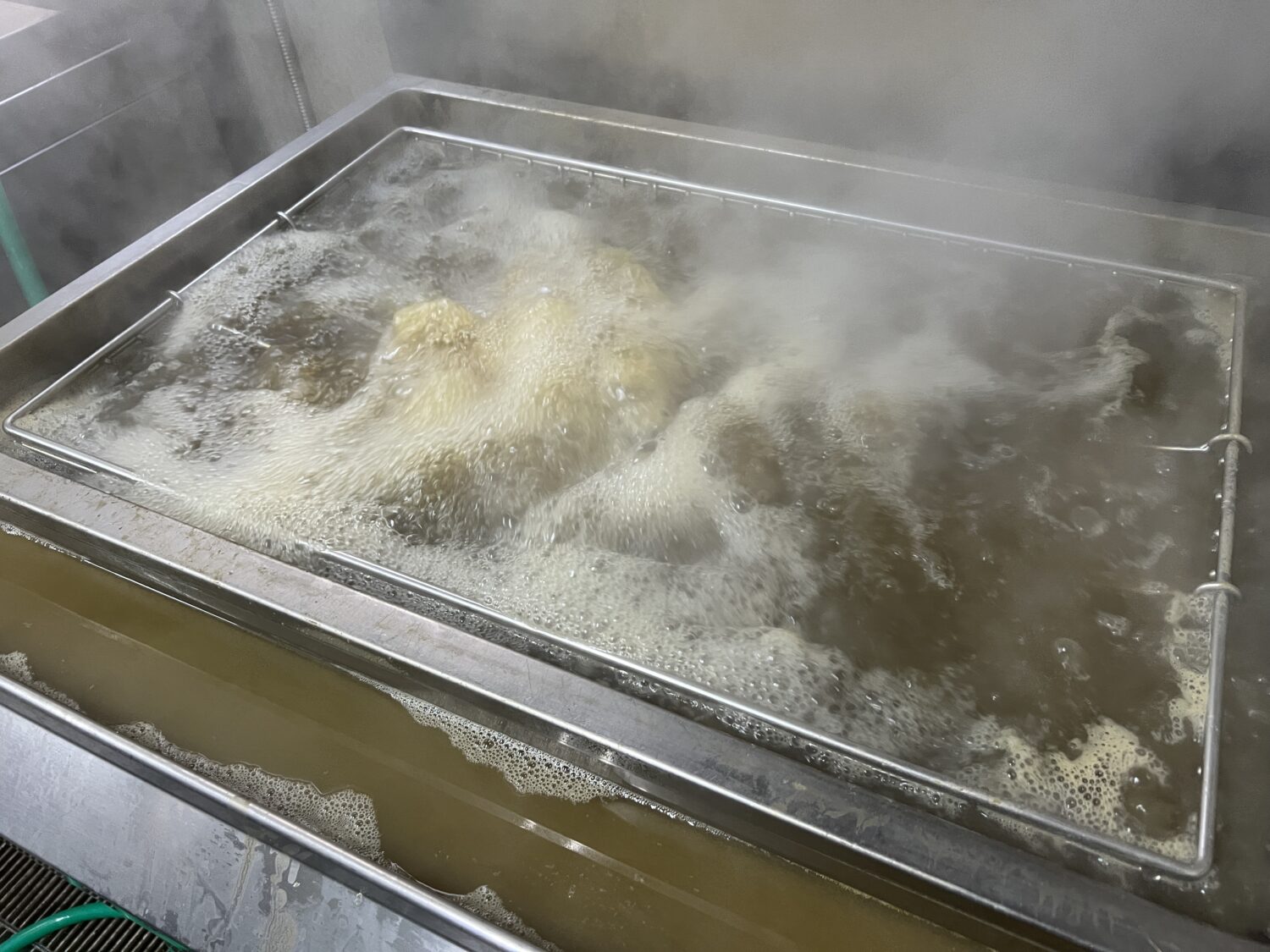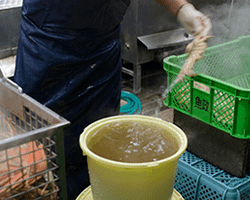 茹で上がりました! ここから、一匹一匹丁寧に圧水をあてて アクや汚れを洗い流します。