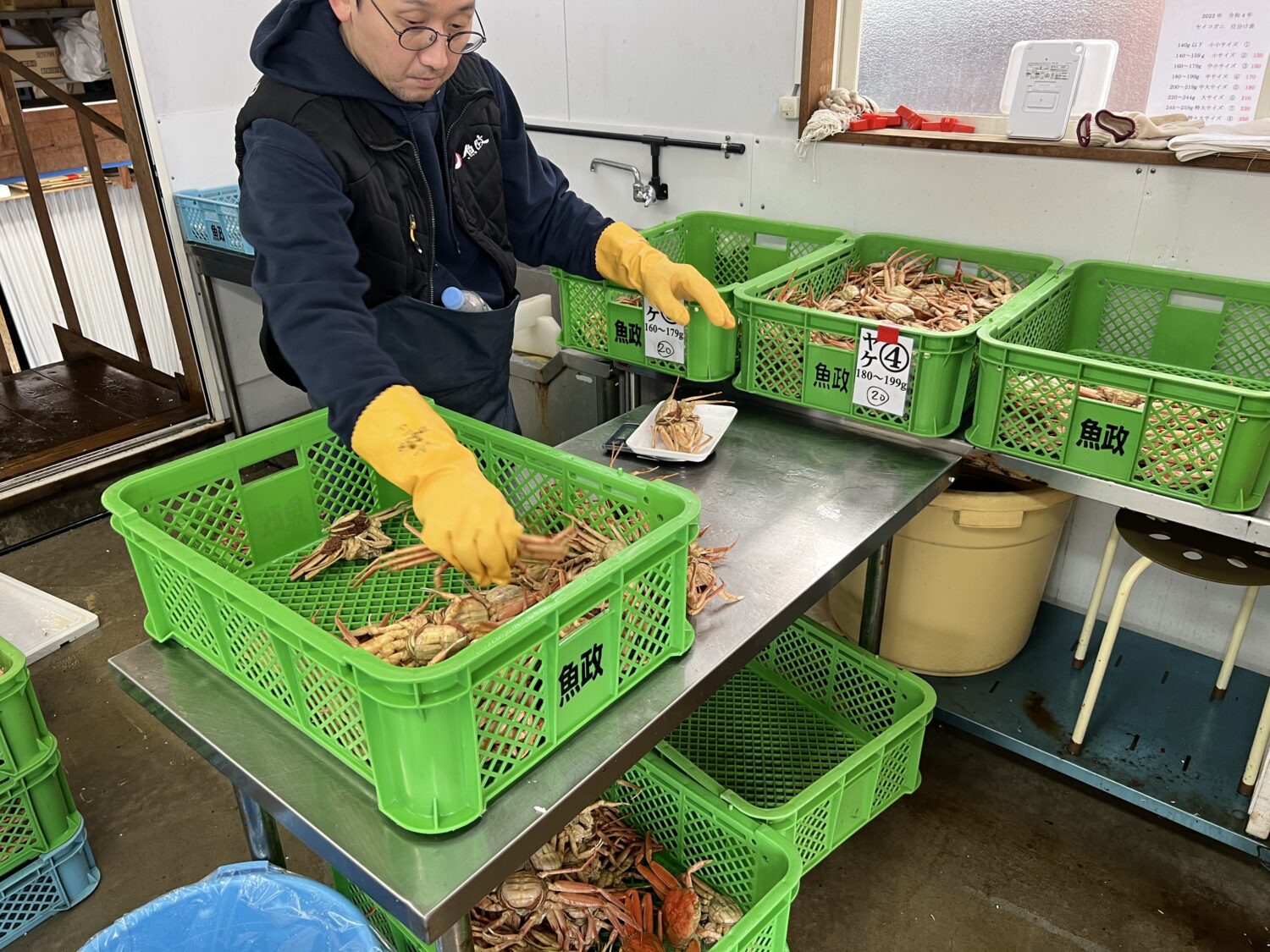 セイコガニならではの、この仕事。 洗い終えたカニは、外子に真水が当たる前、その分 少しですが、水っぽくなります。 その為 魚政では、魔法の水と呼ばれる 塩水に外子を浸し、味を整えます。 これが、魚政のセイコガニの美味しさの秘密です。 何百 何千匹あろうと、この仕事は、怠りません。